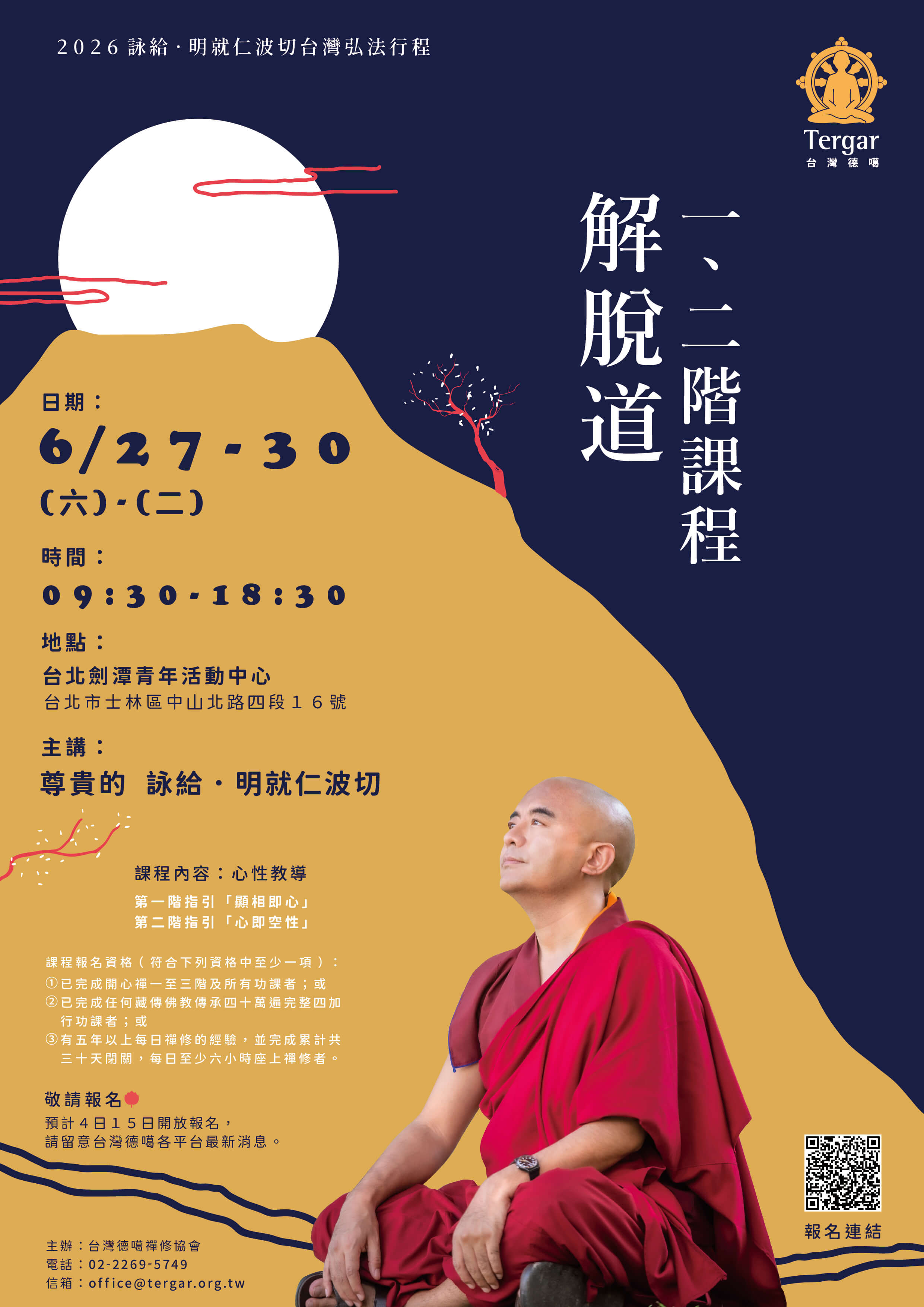 重要事項提醒: 1. 若無收到報名成功通知請先至Email垃圾信件尋找 2. 課前通知信將於X/XX寄發,請留意收信 3. 若註冊報名系統遇到困難,可透過以下任一方式取得協助: 1).發送臉書訊息 2).於官方line@詢問 3).報名諮詢信箱 office@tergar.org.tw 4).週三~週日早上10:00~下午6:00 致電台灣德噶中心(02)2269-5749 4. 明就仁波切台灣行程總覽 請點擊 5. 課程將於4/15凌晨 0:00開放報名 ,額滿為止。(報名至6/10 截止) 6.若發生【學員專區】登入失敗,請開啟密碼顯示功能,確認是否正確輸入密碼,或點選「忘記密碼」透過您註冊時使用的信箱重設密碼 7.若於刷卡過程發生問題導致報名中斷,或刷卡失敗,可至【學員專區】「報名紀錄查詢」將失敗的報名取消後重新報名;或於隔天再次登入系統,找到已報名的課程並重新進行付款,以完成報名